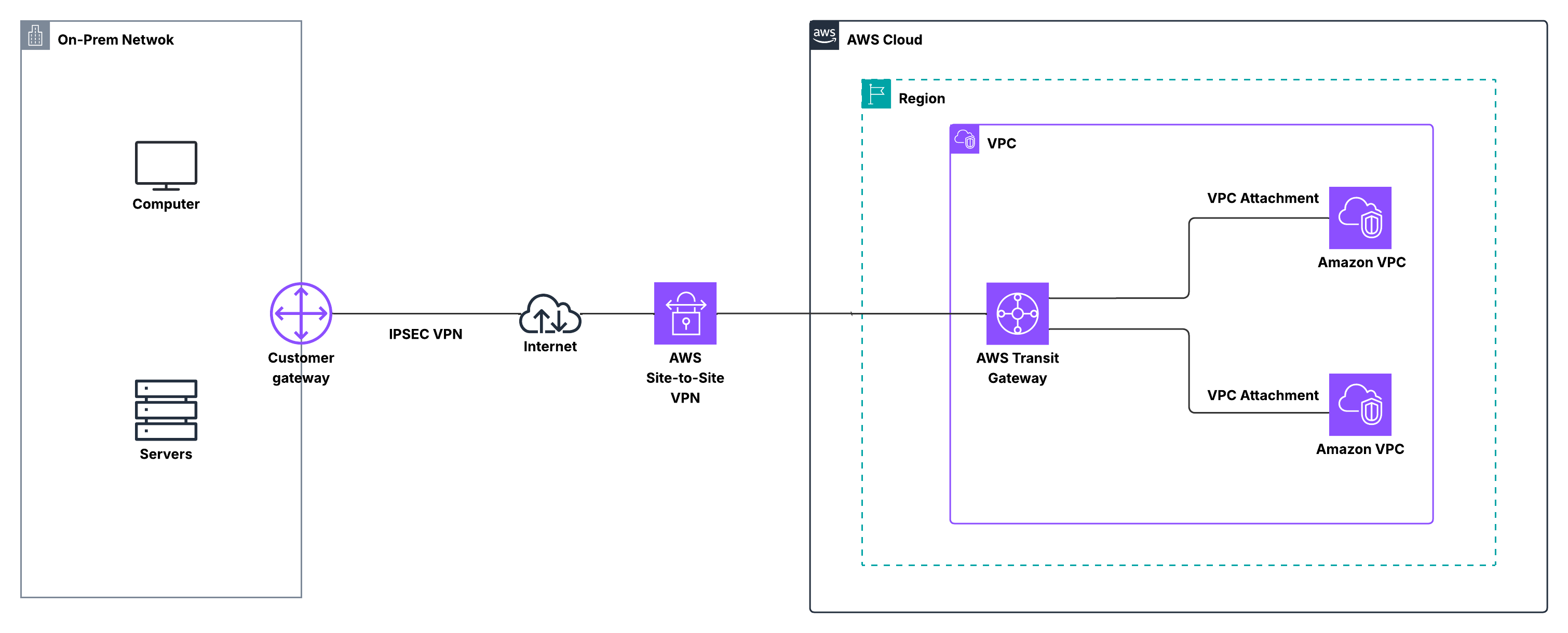 In this model, your on-premises device still functions as the customer gateway, encrypting traffic using IPsec. The encrypted packets traverse the public internet and terminate on a VPN attachment associated with the Transit Gateway.