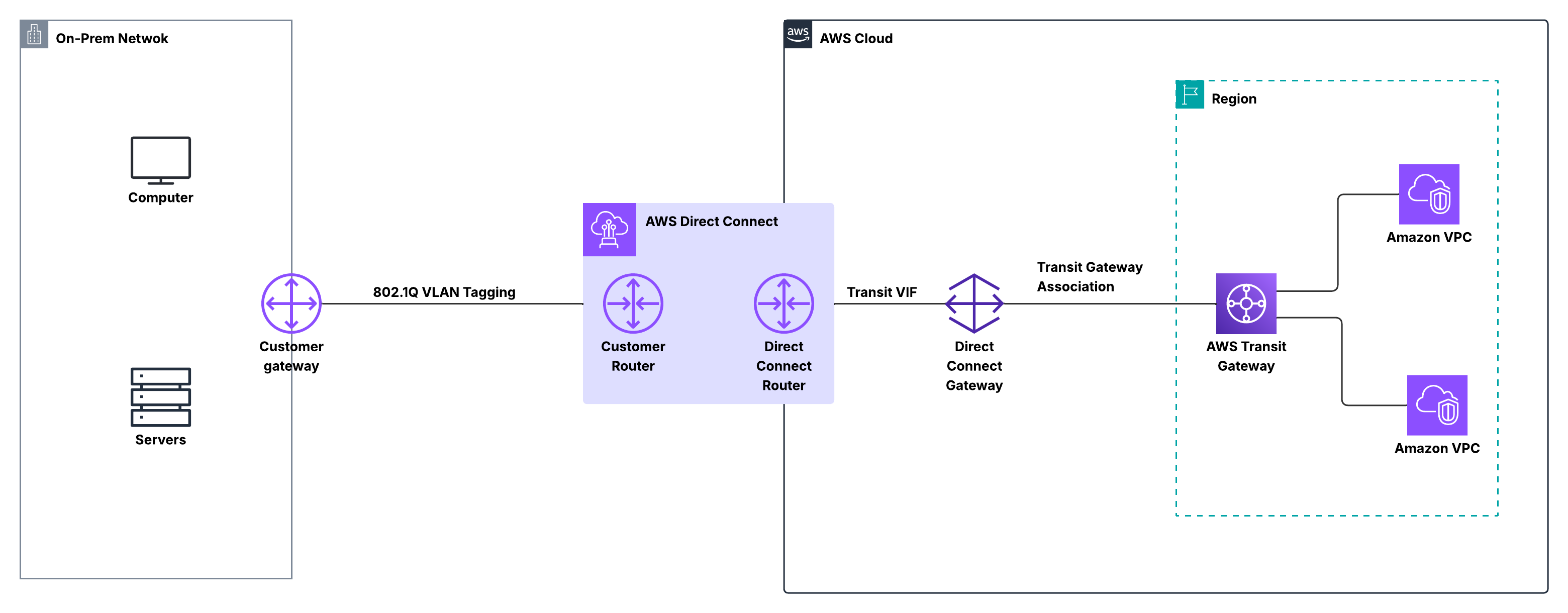This architecture scales naturally: adding a new VPC doesn’t require changes to your Direct Connect configuration. Simply attach the VPC to the Transit Gateway, and routing propagates automatically. Compared to point-to-point designs, this keeps networks consistent, predictable, and easy to operate as they grow.