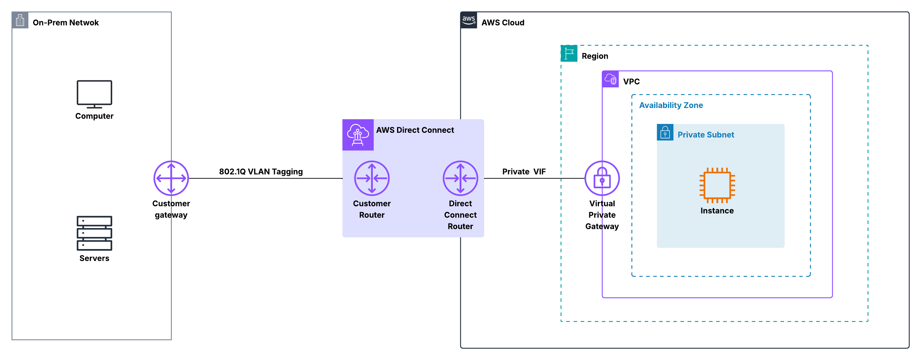 - Private VIF: Provides access to VPCs through a Virtual Private Gateway or Transit Gateway.