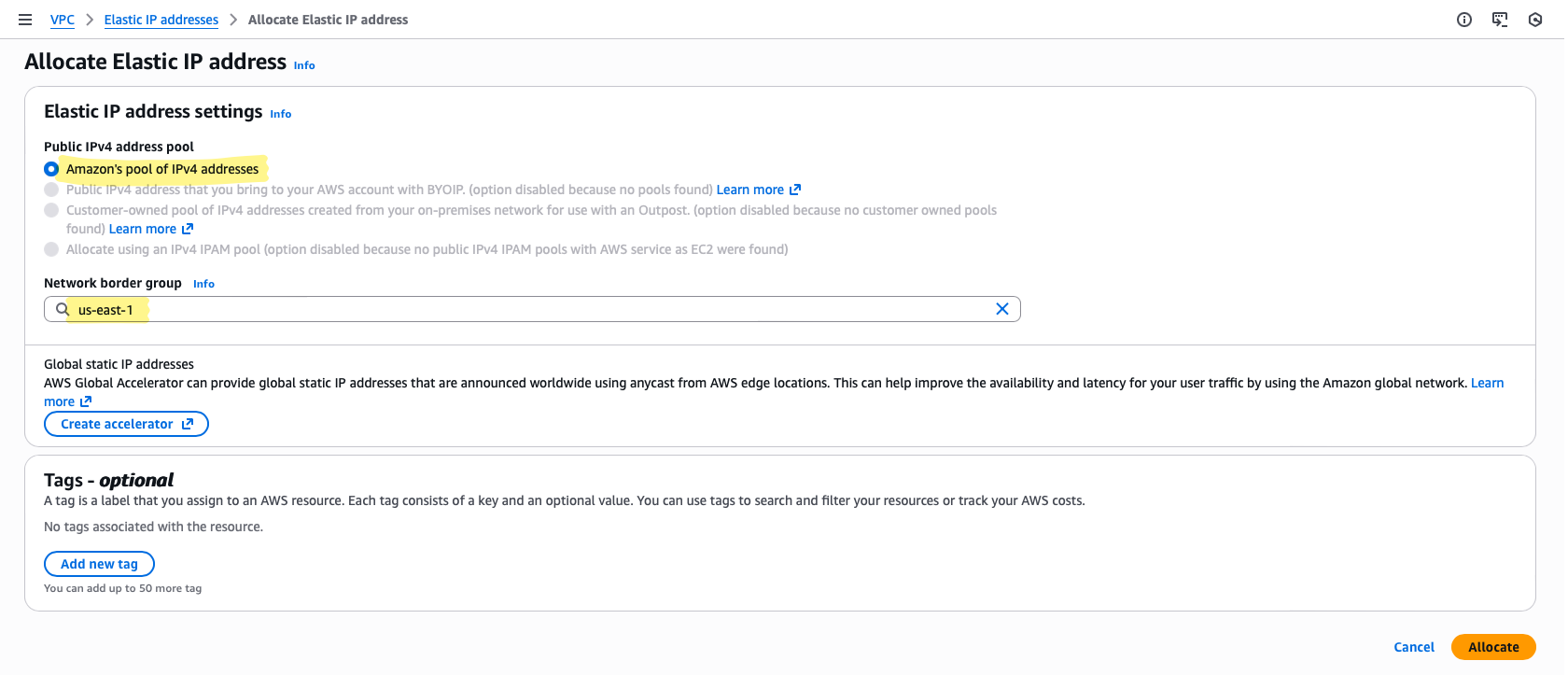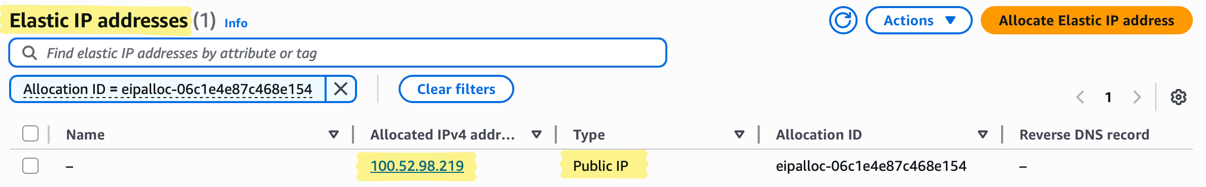 - Elastic IP: select the one you allocated in the previous step