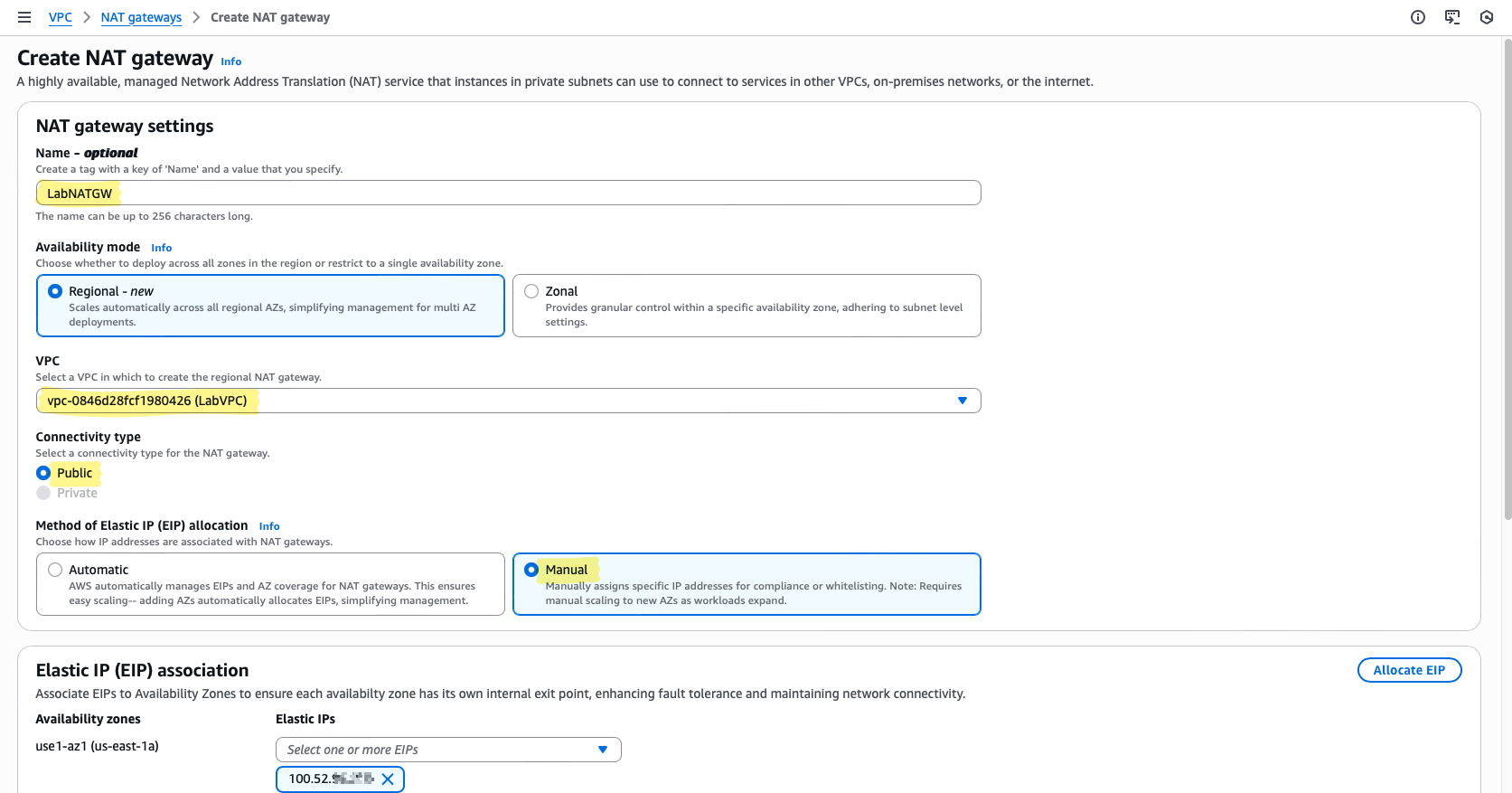 LabNATGW— keep names descriptive to avoid confusion later - Subnet: choose PublicSubnet — a NAT Gateway must reside in a public subnet to reach the Internet