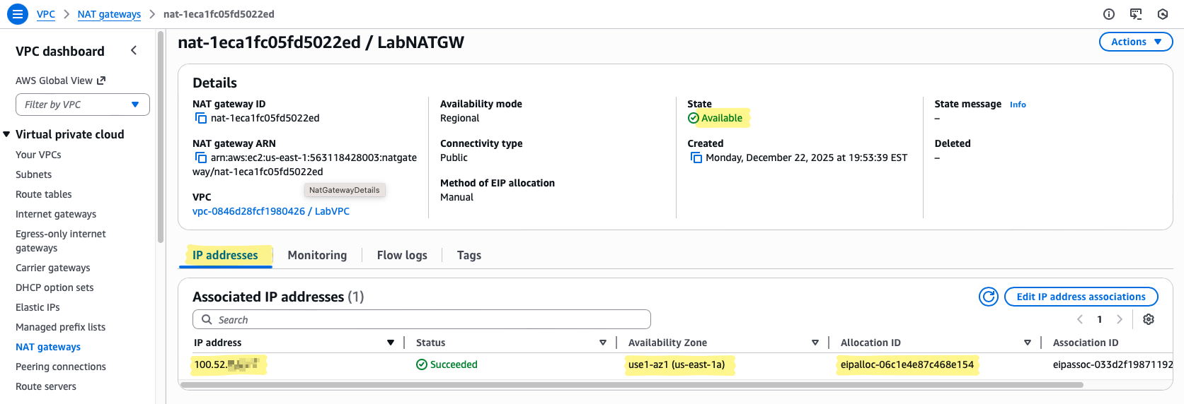 - Take note of this Elastic IP — it will represent all outbound traffic from private instances