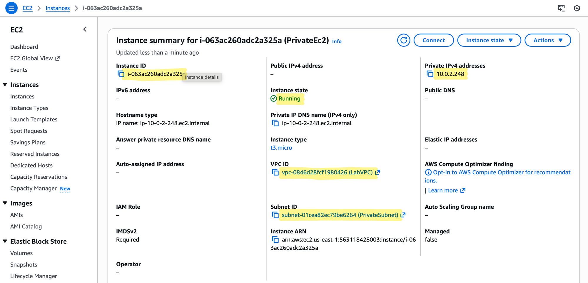 The private instance demonstrates why private subnets exist: isolated from direct Internet exposure, yet still capable of outbound connectivity through the NAT Gateway.