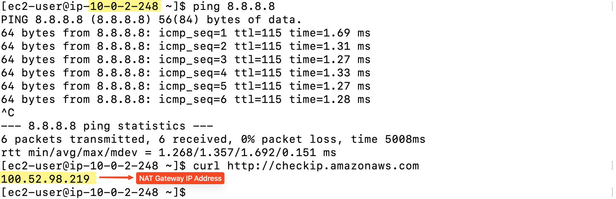 pingconfirms basic reachability.curlwill return the Elastic IP of the NAT Gateway, proving that outbound traffic is properly routed through the NAT.