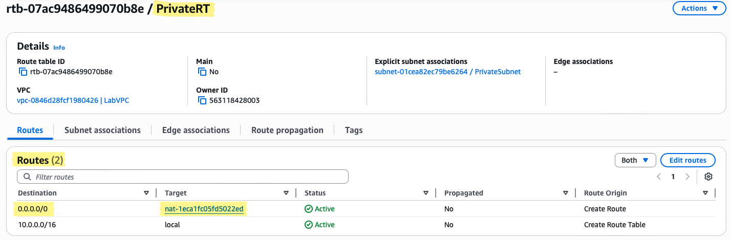 - Navigate to VPC → Route Tables → PrivateRT