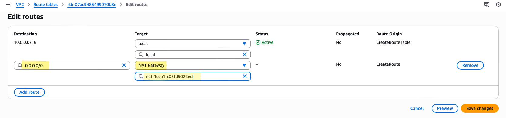 Once saved, this single route enables all private subnet instances to reach the Internet through the NAT Gateway.