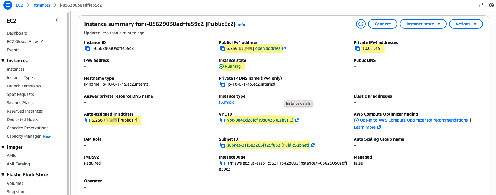 t3.micro— sufficient for lab testing, low cost, and easy to experiment with. - Subnet: