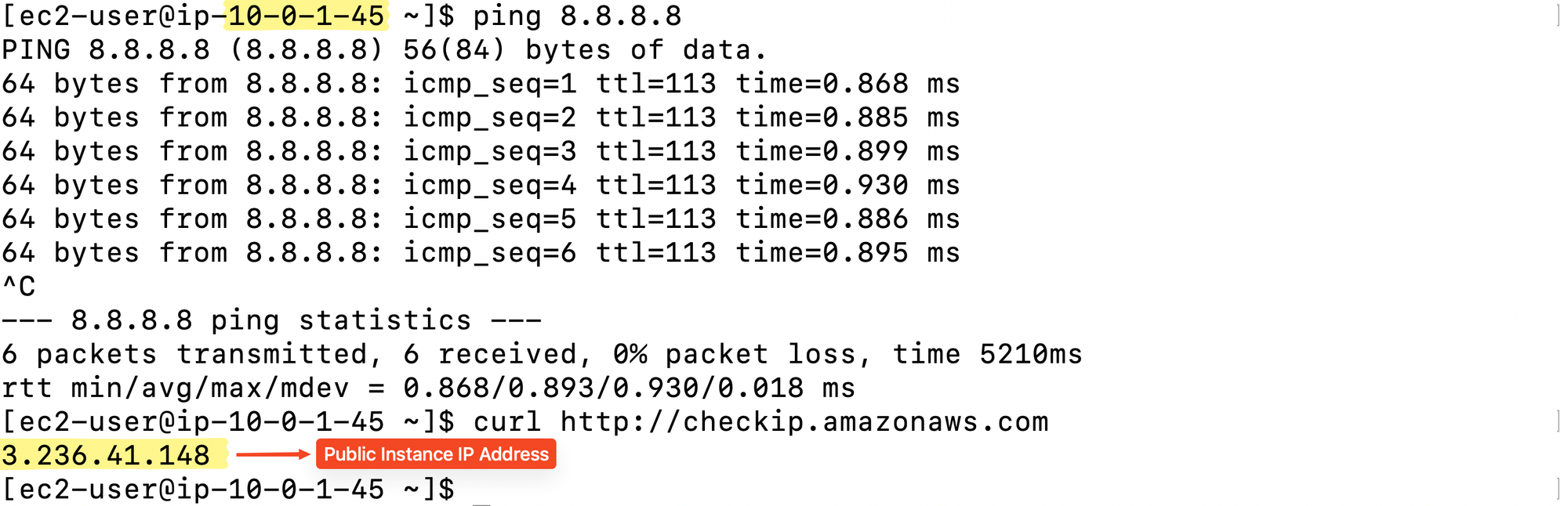 pingverifies basic ICMP reachability.curlreturns the instance’s public IP, confirming it has direct Internet access through the Internet Gateway(IGW).