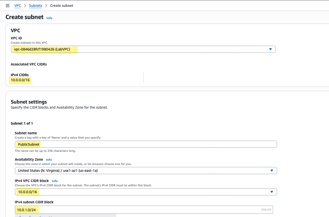 10.0.1.0/24— a small slice of our /16 VPC, sufficient for front-facing resources - Availability Zone: Choose one that fits your architecture or lab setup