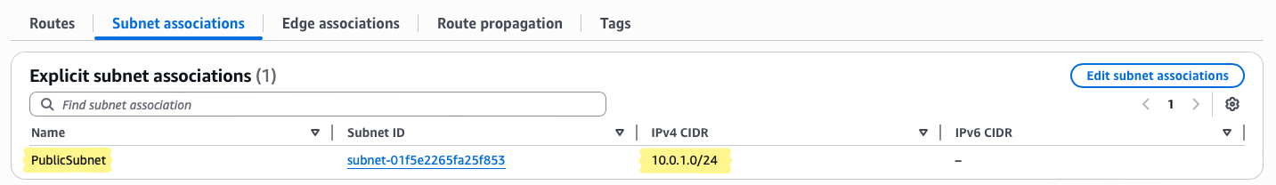 The public subnet’s route table will later direct Internet-bound traffic through the Internet Gateway (IGW). This ensures that resources in this subnet can reach and be reached by the Internet as needed.