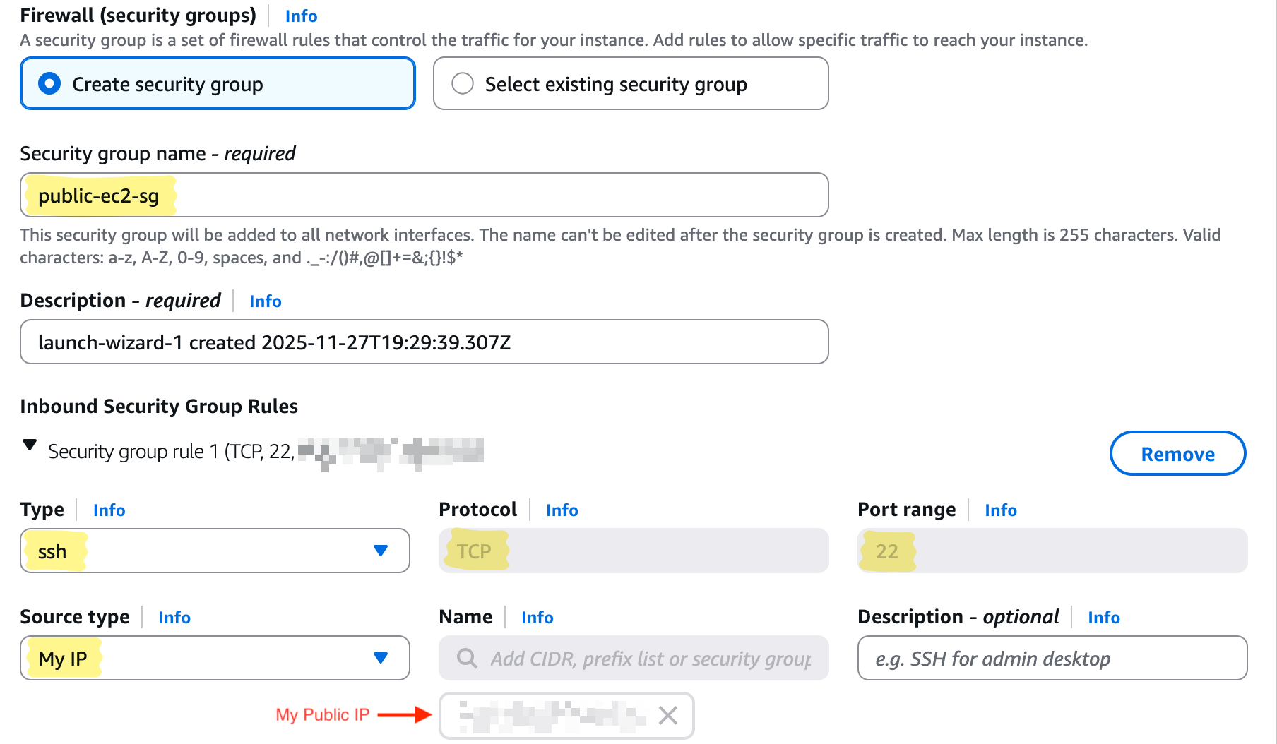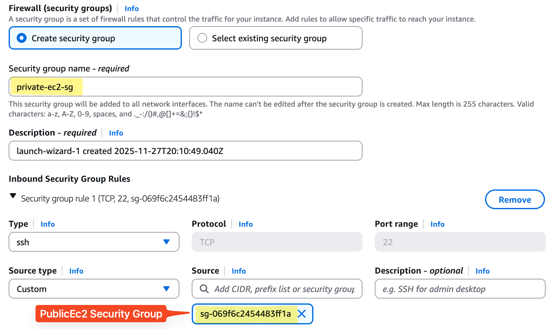 - Security group: Allow SSH (22) only from PublicEc2 security group