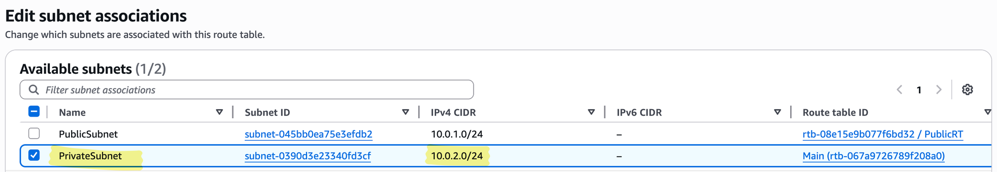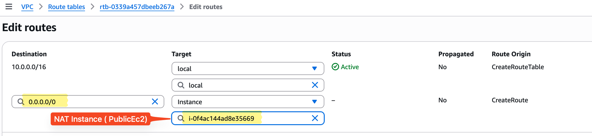 - Go to VPC → Route Tables → PrivateRT → Edit routes