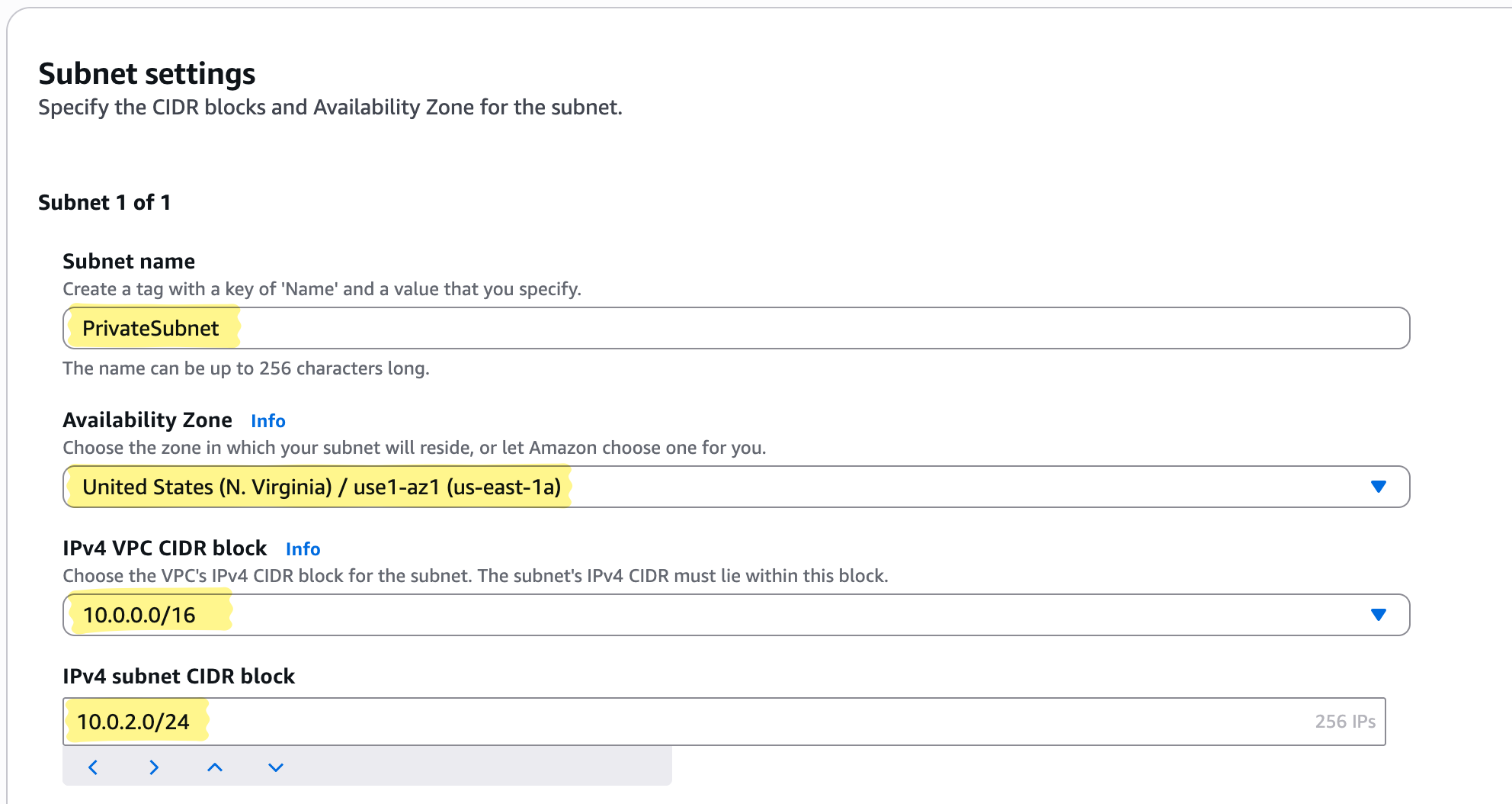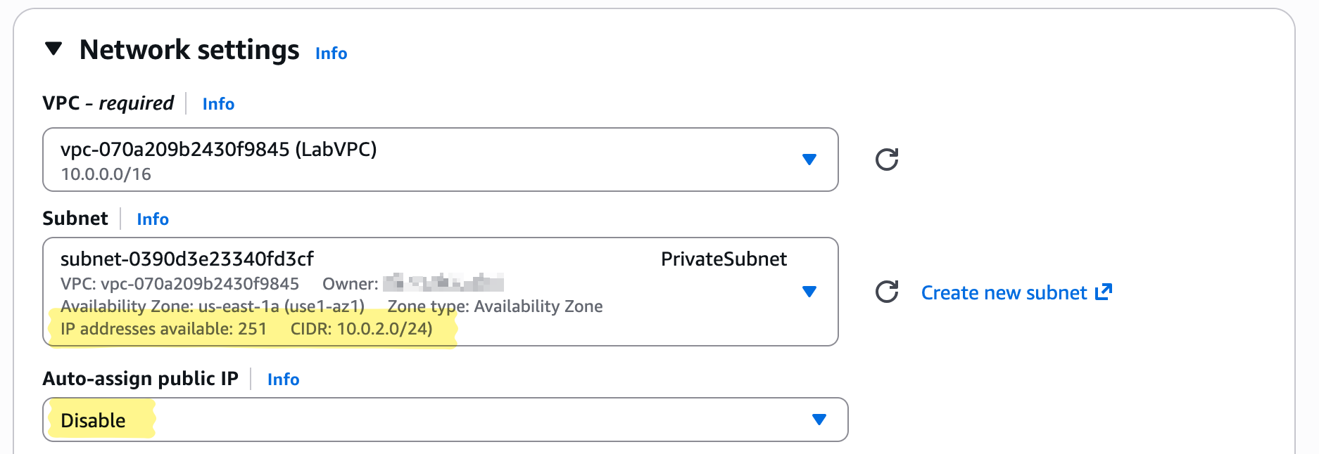 - VPC: LabVPC, Subnet: PrivateSubnet, Auto-assign Public IP: Disable