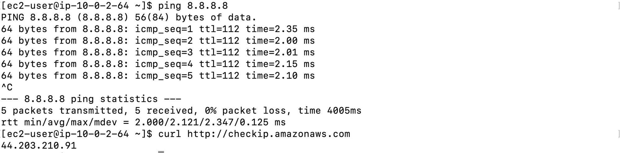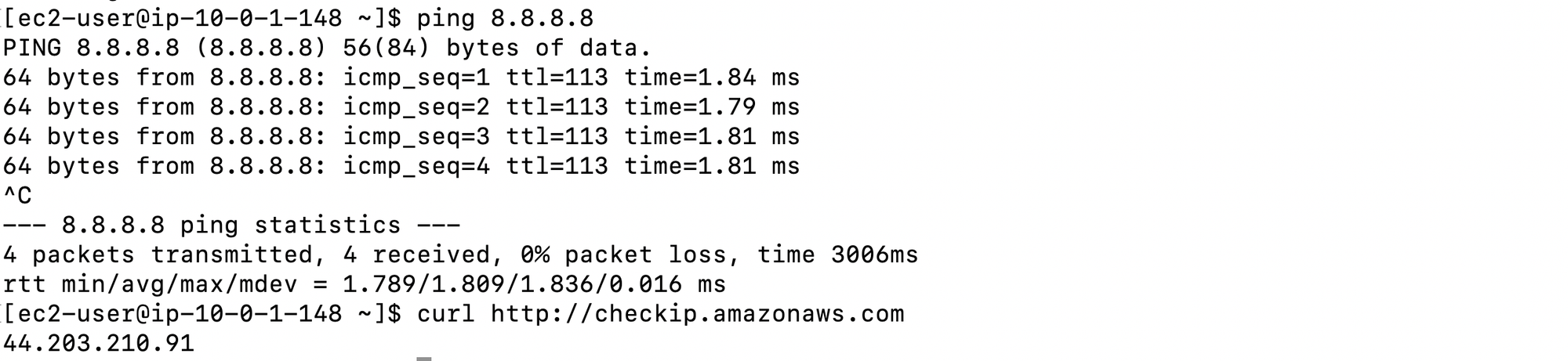 We can log into the public instance using the assigned key pair. Once logged in, we can verify internet connectivity: