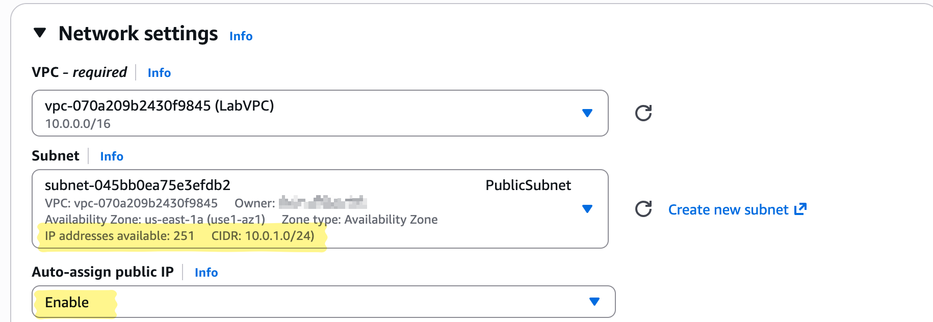 - VPC: LabVPC, Subnet: PublicSubnet, Auto-assign Public IP: Enable
