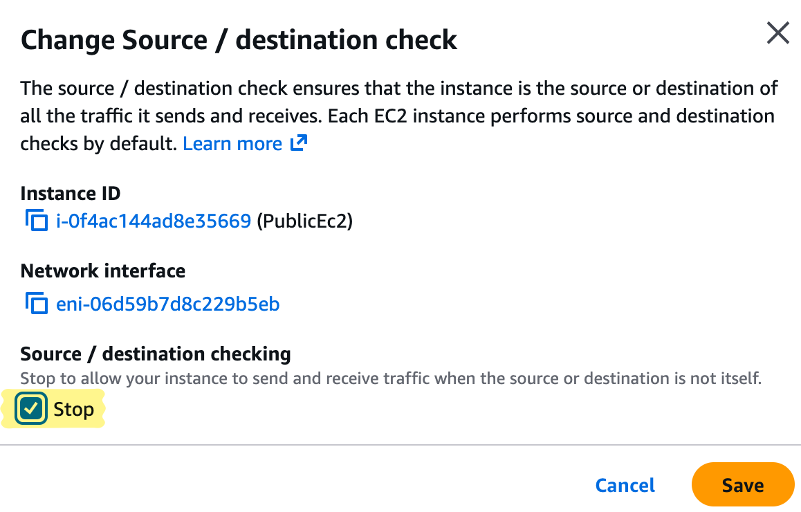 Disable Source/Destination Check on PublicEc2. By default, an EC2 instance is only allowed to send and receive traffic for itself — AWS blocks any packets not sourced from or destined to that instance. Disabling Source/Dest Check allows the instance to forward traffic on behalf of private hosts, which is required for it to function as a NAT instance.